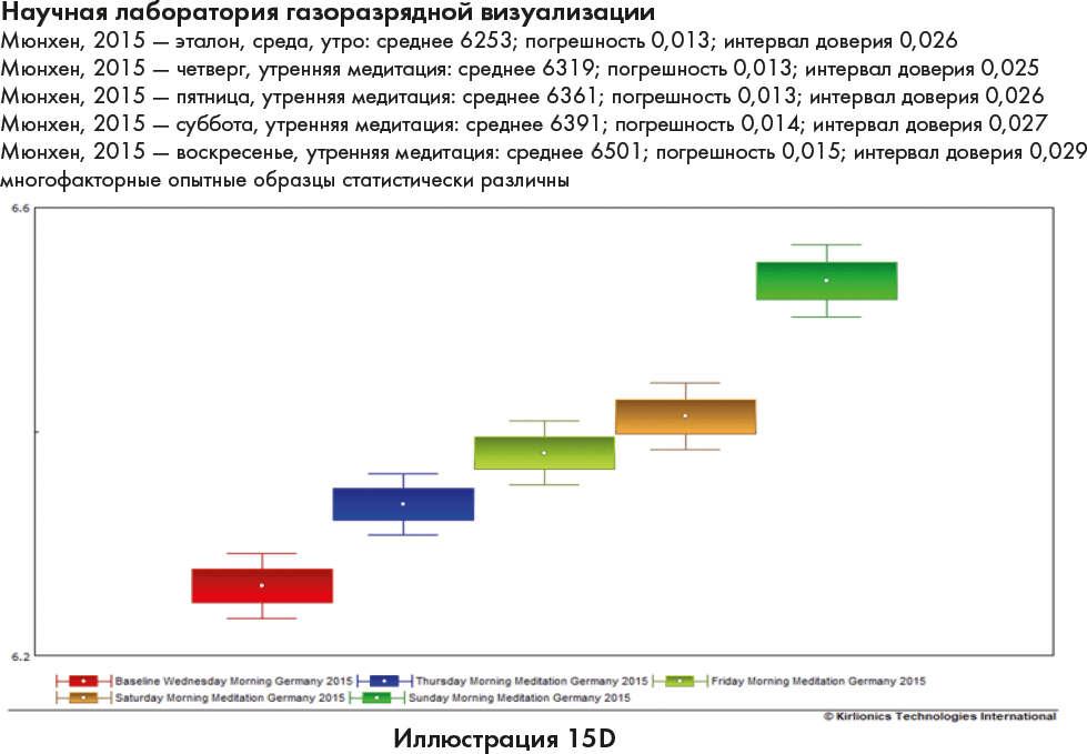 На иллюстрациях 15C и 15D применена та же цветовая схема; однако эти измерения отражают особые промежутки во время каждодневных утренних медитаций. На иллюстрации 15D имеется дополнительная светло-зеленая линия, поскольку мы измеряли энергию в комнате во время медитации на шишковидную железу в 4 часа утра. Как видите, энергия в то утро была очень высокой.