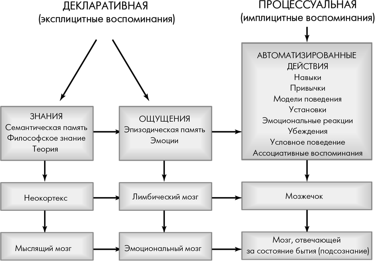 • процессуальная, или имплицитная. Когда мы повторяем какое-либо действие столько раз, что оно становится совершенно автоматическим, – нам больше не нужно о нем думать, и мы едва ли можем объяснить, как именно мы его проделываем, – тело и разум становятся одним целым. Именно в этой системе памяти хранятся наши навыки, привычки, автоматизированные модели поведения, ассоциативные воспоминания, подсознательные установки и эмоциональные реакции.
