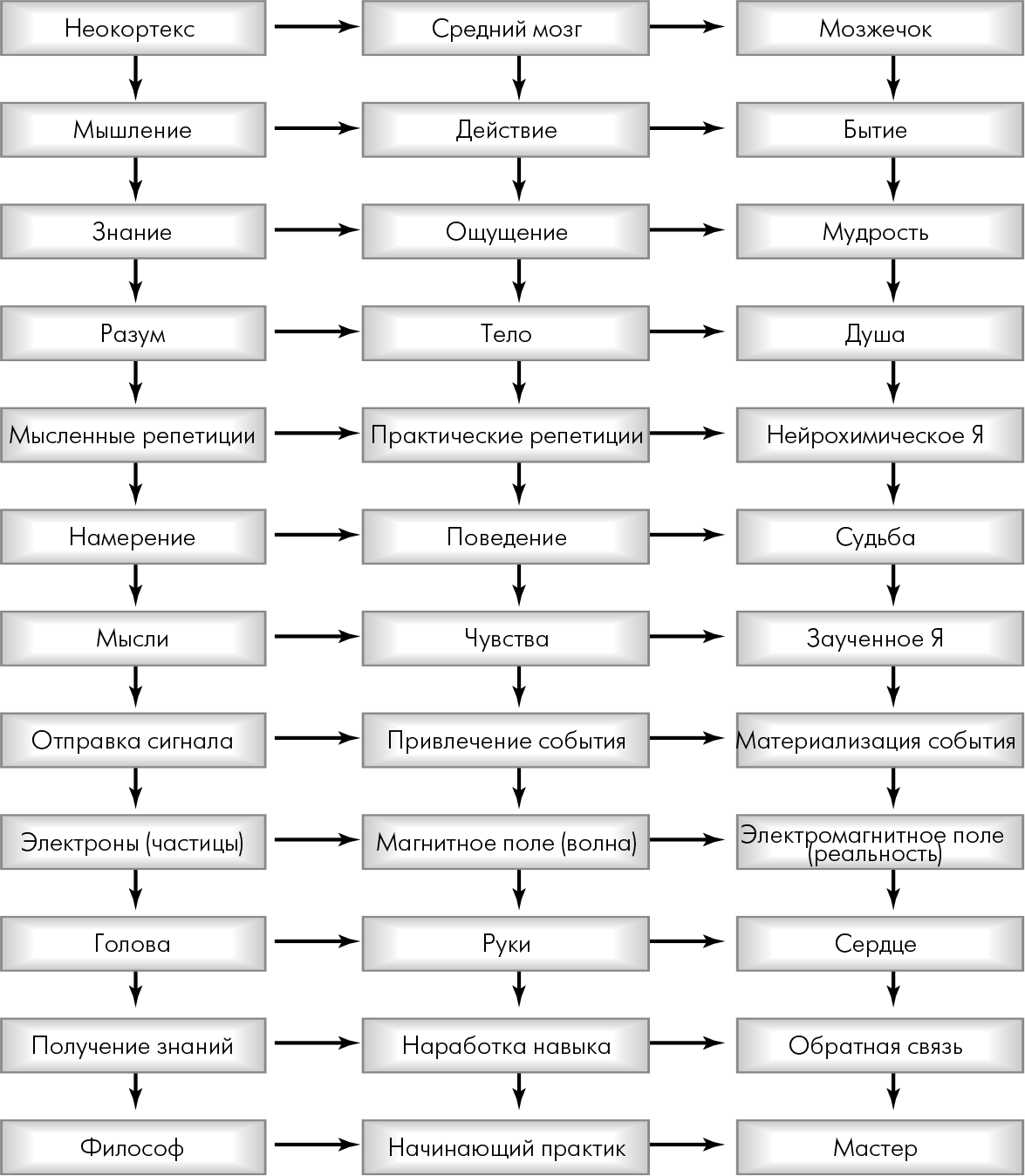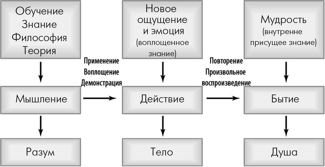 Итак, беря информацию, усвоенную интеллектуальным путем (через неокортекс), и применяя ее на практике, пропуская через себя и проявляя в действии, мы тем самым меняем свое поведение. В результате создается новое ощущение, которое вызывает новую эмоцию (через лимбический мозг). Научившись воспроизводить это ощущение, мы попадем в новое состояние бытия (мозжечок).