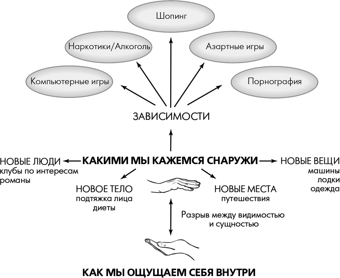 Со временем мы попадаем в зависимость от всего, что способно избавить нас от боли, тоски или депрессии, которые стали нашей второй натурой. Предосудительно ли это? В общем, нет. Люди поступают так лишь потому, что просто не знают, как изменить себя. Они просто следуют за естественным побуждением укрыться от болезненных чувств и подсознательно ждут, что спасение придет извне. Никто не объяснил им, что попытки изменить внутреннее состояние, используя внешние факторы, только усугубляют ситуацию и углубляют разрыв.