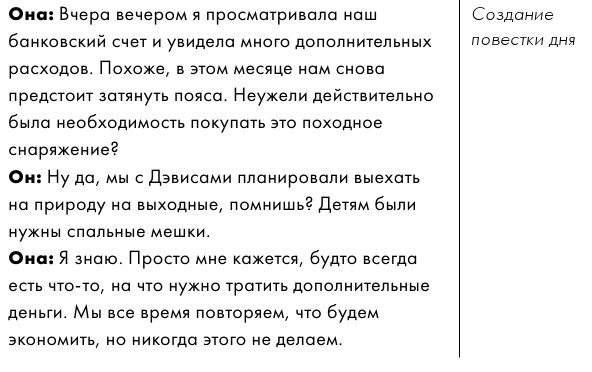 • Первое. Создается повестка дня: один или оба партнера выражают свои переживания по какой-то проблеме.