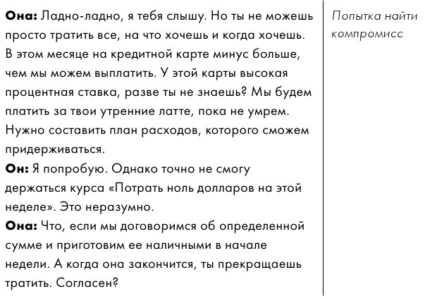 Обратите внимание, эти дипломаты испытывают некоторое напряжение, но остаются довольно спокойными. Каждый излагает собственные опасения. Но затем, на этапе убеждения, они не задерживаются надолго на том, чтобы прояснить более глубинные эмоции, которые каждый испытывает по поводу денег, безопасности и что для них важно в жизни. Оба заинтересованы поскорее найти решение. Но поскольку не говорят о глубинных проблемах, решение, к которому они пришли довольно мирным путем, может не сработать. Они могут вернуться к этому же разговору в следующем месяце, когда текущий банковский счет снова уйдет в минус.