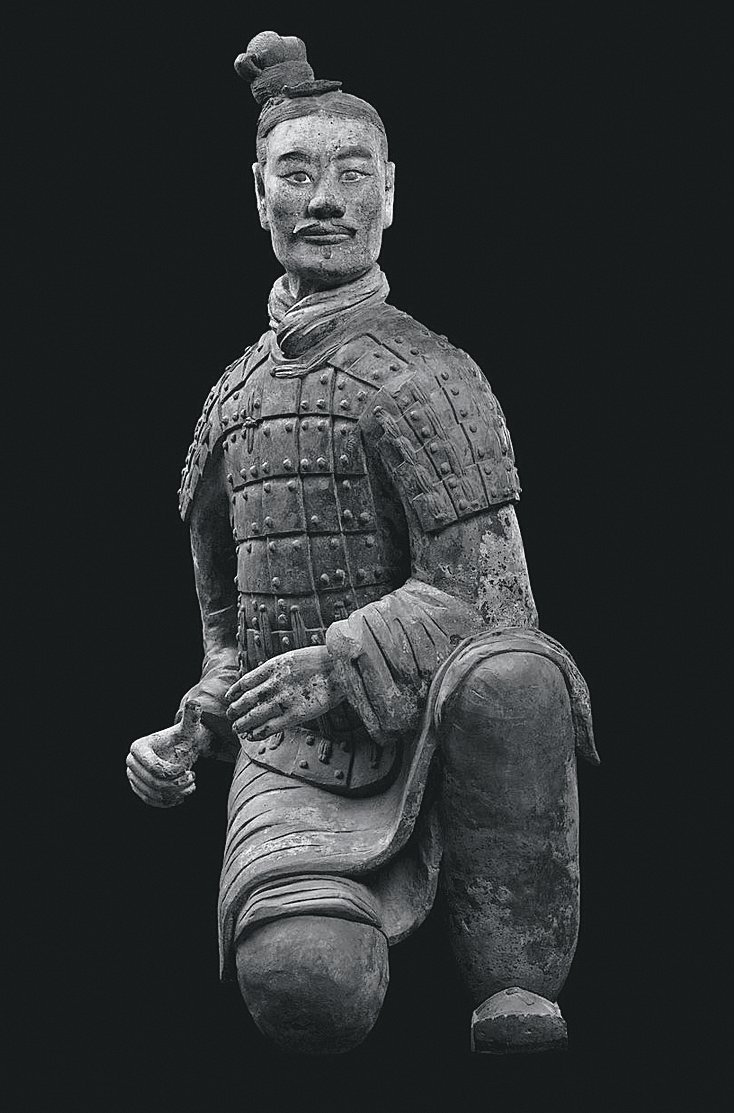Поражает то, что результат этих великих творческих усилий, труда десятков тысяч человек, был обречен на захоронение вскоре после своего завершения, особенно это касается искусно сделанных человеческих фигур, никогда не создававшихся ранее в Китае. Лишь далеко на западе, в Греции, люди умели и желали создавать такие реалистичные скульптуры. Но как могли их знания попасть в Китай? Может, какие-то мастера из греческого поселения в Бактрии проделали долгий путь в Центральную Азию и привезли эти секреты с собой? Или какой-нибудь наблюдательный китайский торговец привез их по дороге, названной впоследствии Великим шелковым путем? Для любого путешественника, совершившего поездку в страны Западной и Центральной Азии по следам завоеваний Александра Македонского, самым удивительным стало бы воспоминание о «живых» каменных людях, схожих с греческими скульптурами. Среди фигур терракотовой армии много разминающихся и растягивающихся «акробатов»: судя по их оголенным торсам, скульпторы обладали хорошим знанием мускулатуры и навыками, соответствующими скульптуре Греции двухвековой давности [13].