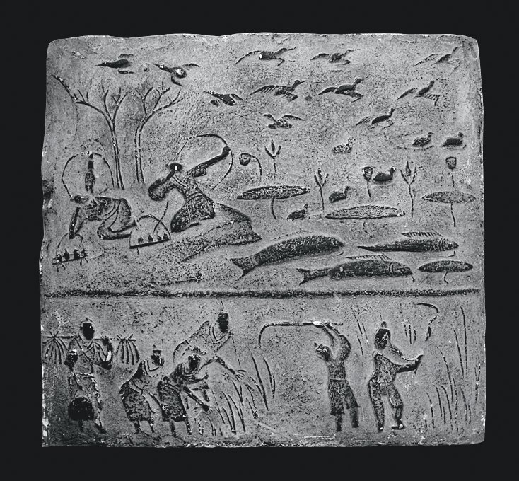 Сцена охоты и сбора урожая. Династия Хань. Около 25–220 н. э. Терракота. 39,5 × 45,6 см