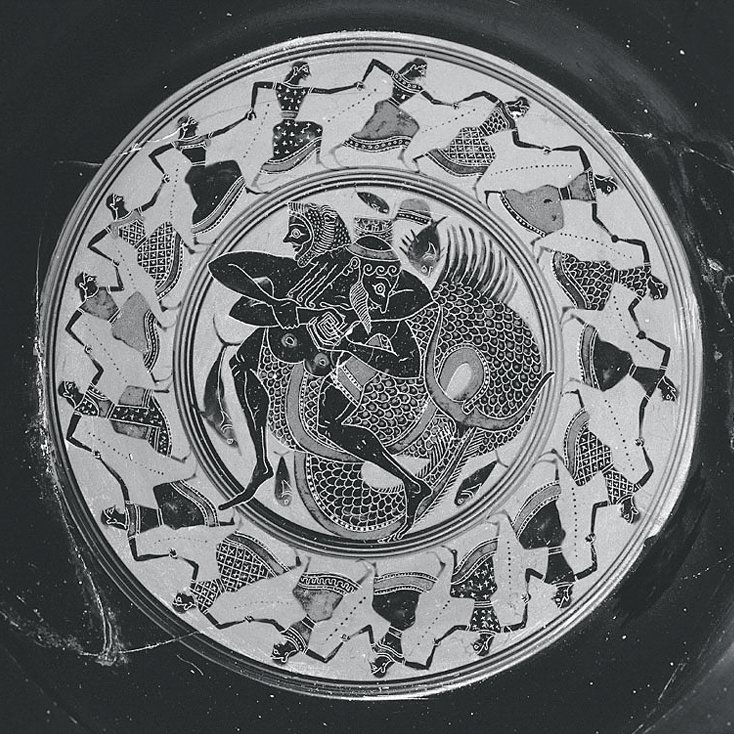 Сначала керамика украшалась абстрактными и геометрическими мотивами, пространство заполнялось кругами, линиями, точками, а в получившихся узорах кипела жизнь и угадывались человеческие формы. Затем геометризованные фигуры сменили жизнеподобные персонажи – они сражались, соревновались, выпивали, прелюбодействовали, разыгрывали сценки, которые рассказывали на рынках бродячие певцы с обветренными лицами. На одной из неглубоких питейных чаш изображена битва мифического героя Геракла – одетого, как ему и подобает, в львиную шкуру – с морским чудовищем Тритоном. Геракл одерживает верх; вокруг их схватки плавают дельфины, а по краям чаши танцуют морские нимфы – нереиды. Фигуры изображены плотным черным цветом, по которому прорисованы – то есть процарапаны – светлые линии. Такая чернофигурная керамика впервые появляется около 700 года до нашей эры в Коринфе – городе передовом, по крайней мере, по части керамики. Пульсирующий ритм танцующих нереид напоминает минойский мир образов.