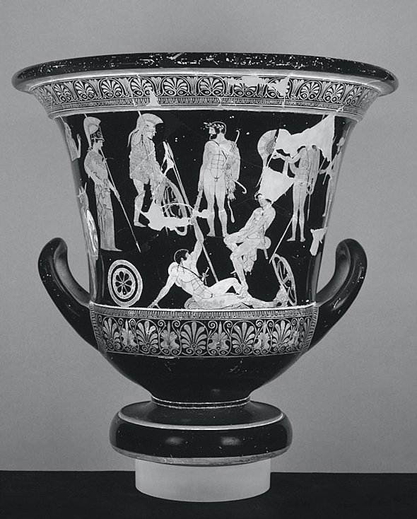 Новая техника вазовой живописи возникла столетие спустя в афинских керамических мастерских. Можно сказать, что это была инверсия: вместо черных фигур на красном (цвет керамики) стали изображать красные фигуры на черном, что позволило сделать рисунок тоньше и детализированнее. Формы стали реалистичнее, полнее, весомее: если раньше фигуры представляли собой темные силуэты, расположенные против света, то теперь свет будто бы освещал их спереди, благодаря чему они превратились в объемные фигуры. Мазки стали более пластичными, позволяя точнее воссоздавать детали. На одном из краснофигурных кратеров (сосуд для смешивания вина с водой) вполоборота изображены два обнаженных воина, отдыхающие рядом с фигурой Геракла, одетого в львиную шкуру, с дубинкой и луком. Бледными линиями даже намечен холмистый пейзаж, на фоне которого расположены фигуры. Художник – анонимный, как и многие авторы греческих ваз, – стал известен как «вазописец ниобид» благодаря сцене, изображенной с другой стороны кратера, – сцене убийства четырнадцати детей Ниобы, неосмотрительно похваставшейся своими детьми перед богами [5].