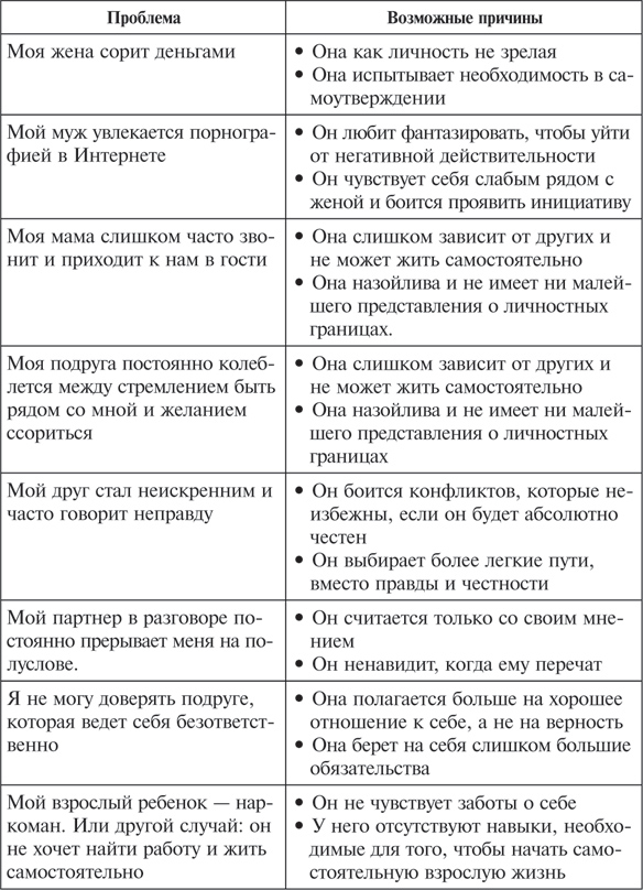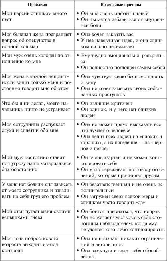 Чтобы подкрепить все вышесказанное примерами из жизни, давайте снова взглянем на предложенный ранее список проблем. На этот раз попытаемся выявить возможные мотивы поведения и значение тех или иных причин, вызывающих это поведение (см. табл. на с. 76, 77). Я привел по два варианта на каждую проблему. Один более значительный, другой менее серьезный. В вашей ситуации у манипулятора могут присутствовать причины обеих степеней сложности, а кроме этого, в каждом конкретном случае может быть намного больше причин.