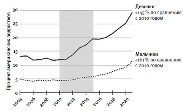 [Закрыть]. Данные за 2020 год были собраны частично до и частично после карантина из-за коронавируса, и к тому времени каждая четвертая американская девочка-подросток успела пережить серьезный депрессивный эпизод. Также можно увидеть, что в 2021 году ситуация ухудшилась; после 2020 года график резче уходит вверх. Но самый большой прирост произошел до пандемии.