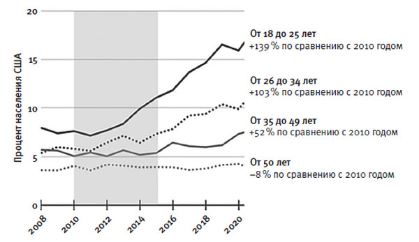 Мы с Грегом закончили писать «Избалованность американского разума» в начале 2018 года. Рисунок 1.1 основан на графике из той книги с данными по 2016 год. Я дополнил его, чтобы показать произошедшие с тех пор изменения. В исследовании, которое ежегодно проводит правительство США, подросткам задают ряд вопросов об употреблении наркотиков и психическом состоянии. Например, случалось ли им испытывать длительные периоды «грусти, опустошенности или подавленности» или периоды, когда они «утратили интерес к вещам, которые приносили им радость». Тех, кто ответил «да» более чем на пять из девяти вопросов о симптомах тяжелой депрессии, относят к категории людей, которые за последний год с высокой вероятностью пострадали от тяжелого депрессивного эпизода.