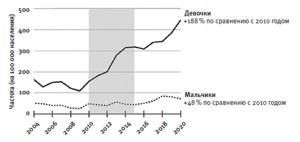 С 2010 по 2020 год процент самоповреждений среди девочек младшего подросткового возраста почти утроился. Для девушек постарше (15–19 лет) он удвоился, а вот для женщин старше 24 лет, напротив, снизился (см. онлайн-приложение)[55]55