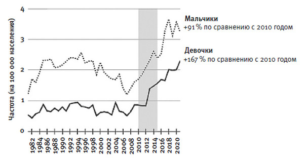 Как видно из рисунка 1.5, уровень самоубийств среди девочек-подростков начал расти в 2008 году и резко подскочил в 2012-м, хотя до этого с 1980-х годов колебался в ограниченном диапазоне. С 2010 по 2021 год этот показатель увеличился на 167 %. Это еще одна подсказка, которая заставляет задуматься: что изменилось в жизнях девочек и девушек младшего подросткового возраста в начале 2010-х годов?