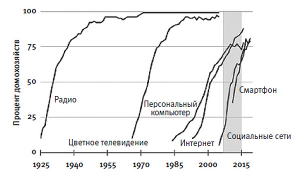 Смартфоны, появившиеся в 2007-м, изменили жизнь каждого. Как и радио с телевидением, они быстро захватили страну и весь мир. На рисунке 1.6 показан процент американских домохозяйств, которые приобретали устройства связи за последние сто лет. Как можно заметить, новые технологии распространялись стремительно и обязательно включали раннюю фазу практически вертикального роста: примерно десятилетие, в течение которого новые устройства покупали едва ли не все.