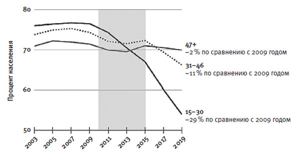 [Закрыть]. Например, на рисунке 1.10 показана частота госпитализации австралийских подростков и молодых людей в психиатрические больницы. Там, как и в остальных странах, проблем не наблюдалось до 2010 года, когда началось Великое подключение. Однако к 2015-му подростки оказались в большой беде.