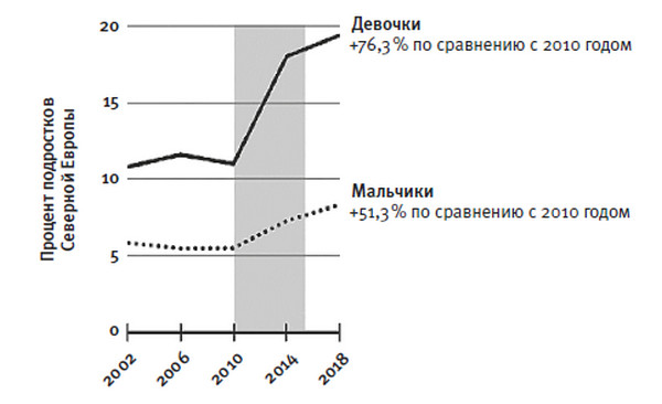 Health Behaviour in School-Aged Children (HBSC) (2002–2018). Графики и данные были систематизированы и подготовлены Томасом Потребным и Заком Раушем.