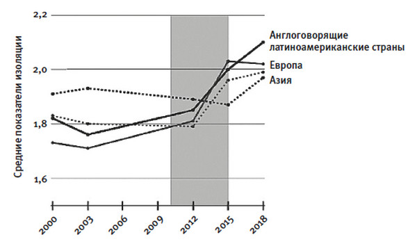 Рис. 1.12. Социальная изоляция в школах по всему миру. Динамика показателей изоляции пятнадцатилетних учащихся в школах по всему миру. Обратите внимание, что рост одиночества в школах наблюдается во всех регионах, кроме Азии, преимущественно в период с 2012 по 2015 год. (В опросах 2006 и 2009 годов соответствующие вопросы отсутствовали.) Шкала оценок: от 1 (минимальная изоляция) до 4 (максимальная). (Источник: Twenge, Haidt et al. [2021]. Данные PISA.)