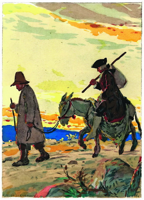 Этот бездельник был мужчиною лет тридцати, с рыжими волосами, крепкого телосложения – истинный крестьянин, который сделался монахом единственно ради того, чтобы жить в праздности. Я отвечал на его приглашение, что, имея спешное дело, не могу составить ему компанию. «Я готов пройти сегодня вдвое больше, – заявил он на это, – если вы согласитесь взять отягощающий меня плащ». Предложение показалось мне забавным, я надел его плащ, а он – мой редингот. После сего переодевания мы являли собой столь комическое зрелище, что смешили всех встречавшихся на дороге. Его плащ тянул не менее поклажи мула. В нем была дюжина карманов, и все полные, да еще пристежная сумка сзади, которую он называл батикуло и которая содержала вдвое, чем остальные карманы, вместе взятые. Хлеб, вино, мясо, свежее и соленое, цыплята, яйца, сыр, ветчина, колбасы – все можно было найти там и жить этим не менее двух недель.