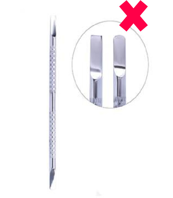 Пушер/шабер представляет собой инструмент, имеющий 2 рабочих конца: лопаточку и топорик. С помощью лопаточки мастер отодвигает кутикулу, а топорик применяется для очистки ногтя от птеригия. У шаберов на ручках нанесены насечки для избежания соскальзывания во время работы. Инструмент изготавливается из медицинской стали
