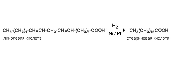 Реакции по двойным связям жирных кислот включают присоединение водорода или галогена, а также окисление различными реагентами (Рисунок 44). Ненасыщенные жирные кислоты или их эфиры могут быть легко гидрированы газообразным водородом в присутствии катализаторов, например тонкоизмельченной платины, палладия или активированного никеля. Если восстановление осуществляется до полного насыщения, то такие ненасыщенные жирные кислоты, как линолевая и линоленовая, количественно превращаются в стеариновую кислоту. Галогены (например, Вr2) легко присоединяются по двойным связям жирных кислот и их эфиров. В подходящих растворителях эта реакция протекает самопроизвольно и в большинстве случаев до конца.
