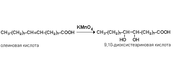 Предполагается, что в этой реакции двойные связи атакуются пероксидными радикалами с образованием неустойчивых гидропероксидов, которые разлагаются с образованием кето– и оксикето-кислот. Окисление по двойным связям происходит значительно быстрее в присутствии озона О3. Предполагается, что вначале образуются нестойкие озониды, которые затем в восстановительных условиях гидролизуются с образованием двух альдегидных групп. Эта реакция используется для установления положения двойной связи в цепях жирных кислот. Идентификация фрагментов, полученных в результате озонолиза и последующего гидролиза в окислительных условиях, также позволяет сделать заключение о структуре исходной жирной кислоты. С этой целью может быть проведено также окисление перманганатом калия. В мягких условиях двойные связи окисляются с образованием гликолей. В жестких условиях тот же реагент расщепляет молекулу по двойной связи с образованием карбоксильных групп по месту расщепления (Рисунок 45, 46).
