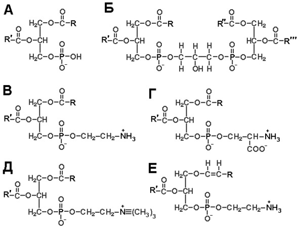 Рисунок 48: Структурные формулы фосфолипидов и плазмалогенов: А-фосфатидная кислота; Б-кардиолипин; В-фосфатидилэтаноламин; Г-фосфатидилсерин; Д-фосфатидилхолин; Е-плазмалоген