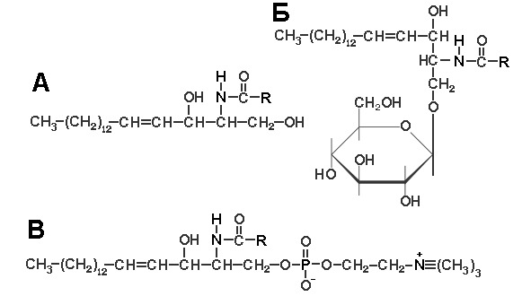 Рисунок 49. Структура сфинголипидов. А-сфингозин; Б-глюкозереброзид; В-сфингомиелин