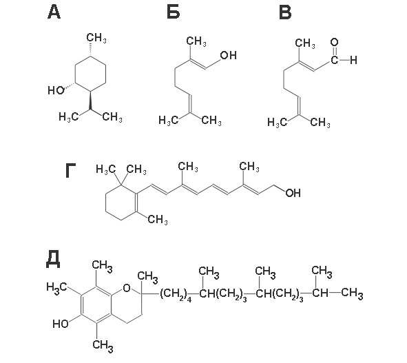 Рисунок 51. Структурные формулы некоторых терпеноидов. А-ментол, Б-гераниол, В-цитраль, Г-витамин А (ретинол), Д-витамин Е (токоферол)