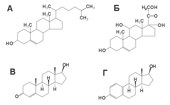 Рисунок 52. Структурные формулы некоторых стероидов. А-холестерин, Б-кортизол, В-тестостерон, Г-эстрадиол