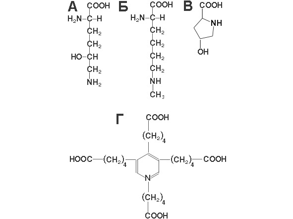 Рисунок 59. Структура небелковых аминокислот. А – оксилизин, Б – метиллизин, В – оксипролин, Г – десмозин.