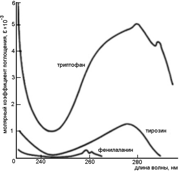 Растворимость аминокислот определяется ее радикалом, его гидрофобность уменьшает растворимость аминокислоты. Ни одна из главных аминокислот не поглощает свет в видимой области, лишь три из них поглощают свет в близком ультрафиолете. Наиболее сильно поглощает триптофан (максимум поглощения около 280 нм), значительно слабее тирозин (280 нм) и еще слабее фенилаланин (около 260 нм). Большинство белков содержит тирозин, поэтому распространенным методом определения концентрации белков является измерение оптической плотности при 280 нм. Цистин обладает слабым поглощением при 240 нм благодаря дисульфидной группе. Все аминокислоты поглощают в дальнем ультрафиолете (<220 нм) (Рисунок 60).