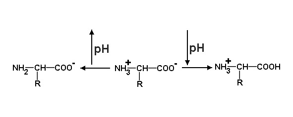 Если к нейтральному раствору α-аминокислоты, содержащему биполярные ионы, прибавлять кислоту, увеличивая концентрацию ионов водорода, последние будут присоединяться к карбоксилатным группам, превращая их в незаряженные карбоксильные группы. При этом аминокислота, в которой заряды первоначально были скомпенсированы, приобретет суммарный положительный заряд, в частности в электрическом поле она будет перемещаться, к катоду.