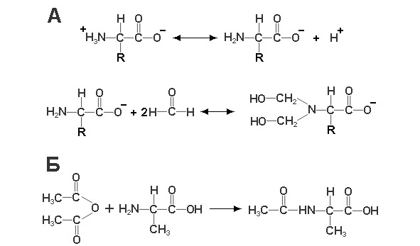 Рисунок 62. Химические реакции аминокислот. А-формольное титрование, Б-ацилирование производными кислот