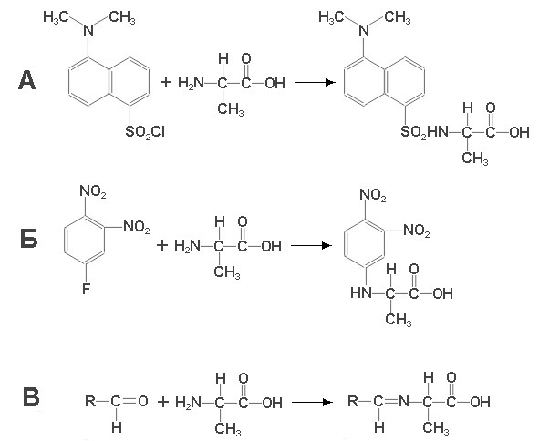 Рисунок 63. Химические реакции аминокислот. А-дансилирование, Б-арилирование, В-реакция с альдегидами