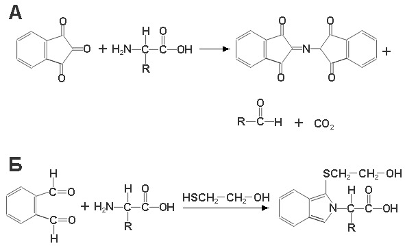 Рисунок 64. Химические реакции аминокислот. А-реакция с нингидрином, Б-реакция с фталевым альдегидом