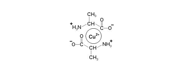 1 Соли аминокислот с некоторыми ионами металлов, в частности с ионами двухвалентной меди, никеля, кобальта, образуются при участии как карбоксилат-иона (ионная связь), так и аминогруппы (координационная связь), причем возникают весьма устойчивые бициклические (клешнеобразные, или хелатные) структуры, в которых ион металла координирован с двумя молекулами аминокислоты, например медная соль лизина, в образовании которой участвуют карбоксильная и аминная группа при углеродном атоме (Рисунок 65). ε-Аминогруппа в комплекс не входит и остается свободной, что может, быть использовано для проведения реакций, специфически затрагивающих только удаленную аминогруппу. Такие комплексы интенсивно окрашены, например комплексы меди с аминокислотами – в фиолетово-голубой цвет. Такая реакция называется биуретовой.