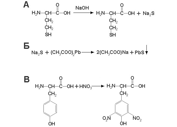 Рисунок 67. Химические реакции аминокислот. А, Б-реакция Фоля, В-ксантопротеиновая реакция