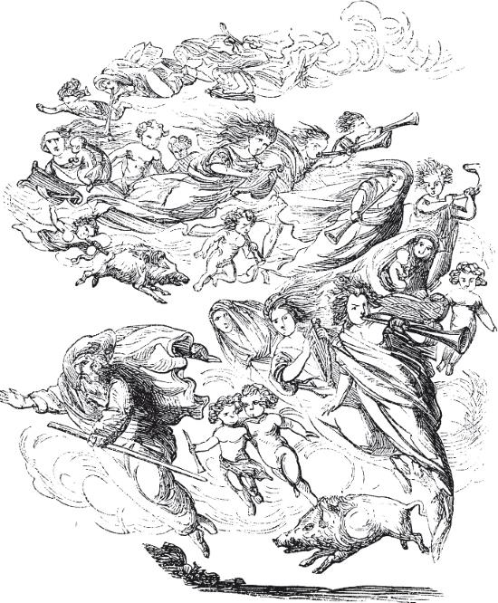 Однако вернемся к Дикой охоте, пока вдали еще не стих лай черных гончих. Ее появление предвещало войну, голод, мор. А тот, кто увидел эту ночную погоню своими глазами, либо умирал на месте от ужаса, либо в недолгом времени угасал от непонятной хвори и тоски. Случалось, что кто-то из толпы всадников на полном скаку швырял в человека кусок гнилого мяса – это была печать проклятия, несущая болезни его домочадцам и домашнему скоту. А вот брошенная лошадиная нога могла обернуться наутро слитком золота. В звонкий драгоценный металл превращался и навоз, оставленный призрачными конями, и находились отчаянные смельчаки, которые бросались на эти комья грудью. Правда, поговаривали, что это золото тоже проклято.