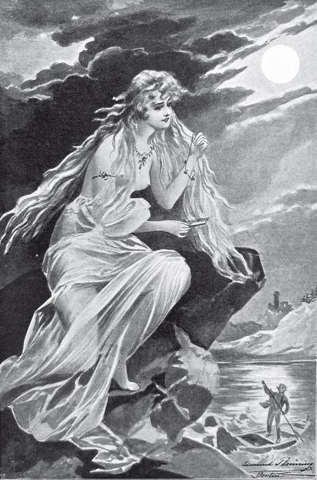 Мировую славу и бессмертие Лорелее подарил, бесспорно, Генрих Гейне. Но он был далеко не первым, кто обратился к образу роковой рейнской чаровницы. А ее литературным «отцом» был поэт Клеменс Мария Брентано. В самом начале XIX столетия он совершал путешествие по Германии и в среднем течении Рейна, где русло реки стеснено горным массивом, обратил внимание на одинокую скалу, высящуюся над водой. С этой скалой было связано немало местных преданий: считалось, что в ее потаенных подводных пещерах охраняли свои сокровища карлики, а виновницами многочисленных кораблекрушений в этих водах объявляли, конечно же, русалок. Однако образ золотоволосой рейнской сирены, чей сладкий и печальный голос неумолимо влечет гребцов на скалу, создал именно Брентано. Само же имя Лорелея, видимо, изначально относилось не к девушке, а к месту – оно переводится как «шепчущая скала».