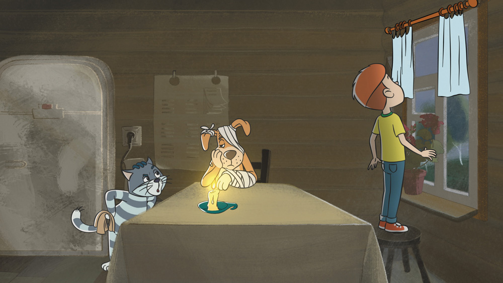 А наутро в Простоквашино разыгралась гроза. Матроскин, Шарик и Дядя Фёдор сидели за столом при свечах и пили чай.