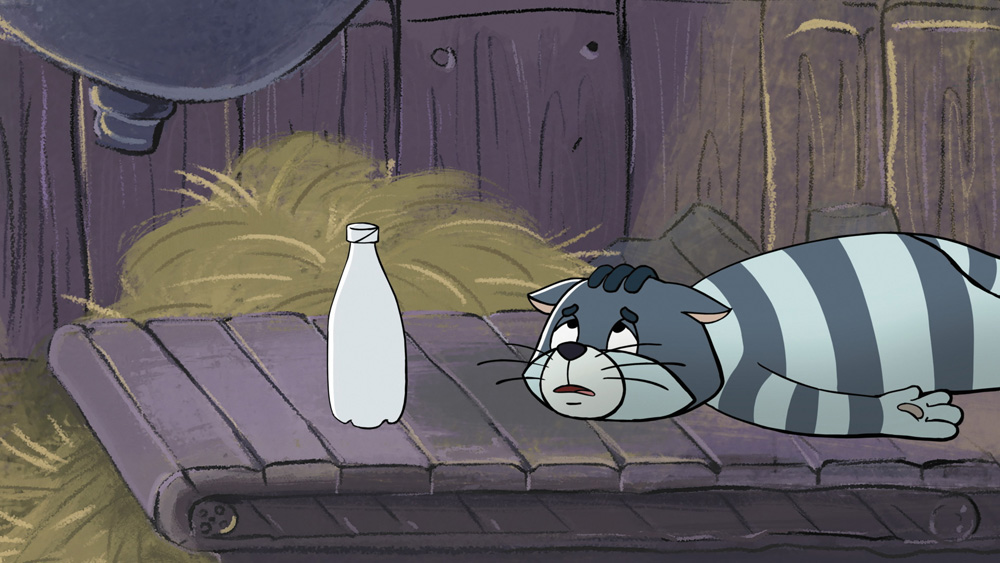 Матроскин взял бутылку с конвейера. Из неё упала единственная капля молока.