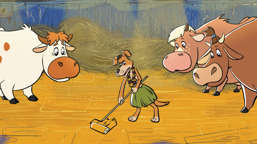В этот момент в коровник влетел перепачканный краской Галчонок. Яркой птичкой коровы сразу заинтересовались. Гаврюша даже встал… и нечаянно опрокинул тележку, где Шарик вздыхал. Пёс кубарем покатился в стог сена. Солома повисла на нём, точно юбка. Шарик вскочил, попятился и тут – бах! – незамеченные им в траве грабли ударили его по голове. Он схватился за палку и зашипел от боли. В травяной юбке и с граблями-копьём в лапах Шарик был очень похож на дикаря. Вокруг него летал Галчонок. Разноцветный, как попугай.