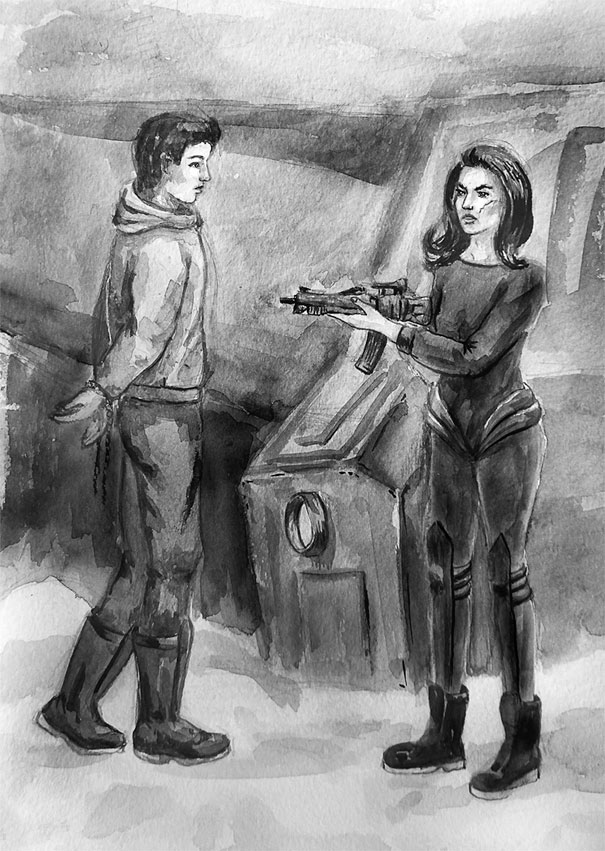 – Не двигаться! – хмуро предупреждает высокий шатен в тёмном комбинезоне, наводя оружие на брюнетку, застывшую от неожиданности происходящего: она явно не ждала подобного хода событий.