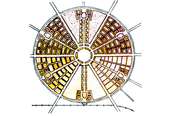 Родившись как чисто протагонистское [274] представление, идеальный город впоследствии становится представлением об идеальном общественном устройстве в соответствии с теми или иными системами общественных ценностей. Таким образом, с древнейших времен общественная мысль рассматривает город как основной элемент общественного устройства (не следует забывать, что границы государств часто совпадали с границами городов). Впоследствии эти представления возрождались на разных этапах жизни западной цивилизации, сохраняя при этом первоначальные смыслы. Не погружаясь в тонкости философского и архитектурного осмысления идеального города, приведем некоторые его образы, известные нам из древней и новой истории, а также и некоторые попытки его воплощения (рисунки 98—101).