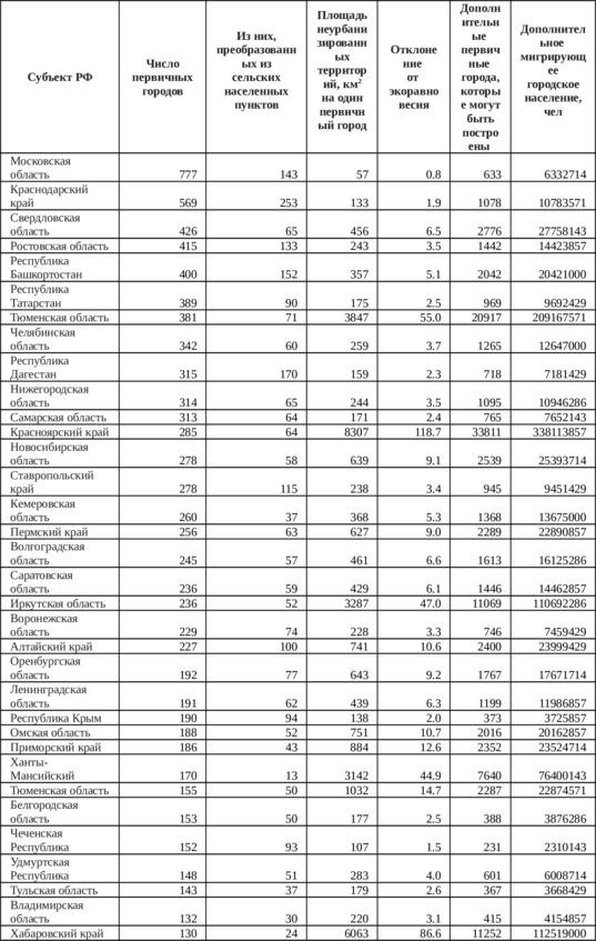Приложение 2. Таблица 8. Расчетные пространственные возможности территорий субъектов Российской Федерации по строительству новых центров расселения и приему дополнительного населения с сохранением экологического равновесия