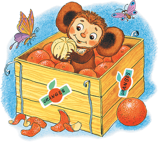 Недолго думая, Чебурашка забрался в один из них и стал завтракать. Он съел целых два апельсина и так объелся, что ему трудно стало передвигаться. Поэтому он прямо на фруктах и улёгся спать.