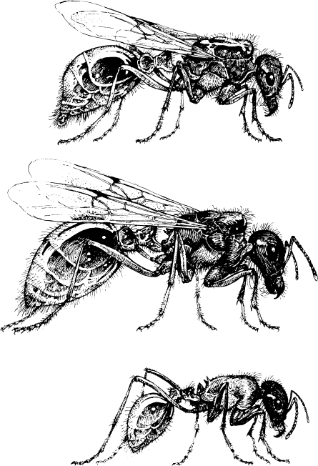 Сверху вниз: самец, крылатая самка и рабочий американских муравьёв-жнецов Pogonomyrmex barbatus. (Рисунок Джона Д. Доусона, предоставлен Национальным географическим обществом США.)