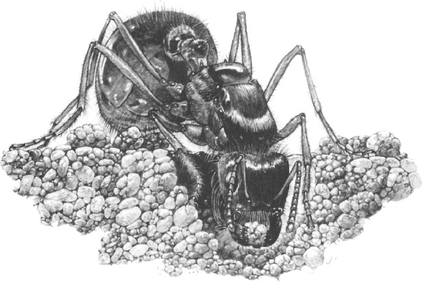 Только что оплодотворённая после брачного полёта королева муравья-жнеца обрывает свои крылья, продавливая их вперёд с помощью средних и задних пар ног. (Рисунок Джона Д. Доусона, предоставлен Национальным географическим обществом США.)