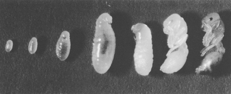 Полный цикл развития рабочей особи европейского муравья Leptothorax acervorum. Слева направо: яйцо, недавно вылупившаяся личинка (первого возраста), подросшая личинка, полностью сформированная личинка, предкуколка (формируются ткани взрослой особи), непигментированная куколка, пигментированная куколка, готовая стать активной шестиногой взрослой особью. (Фотография Норберта Липски.)
