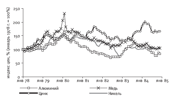 Рис. 3.6. Помесячная динамика текущих цен на цветные металлы на мировом рынке в 1978–1984 гг.
