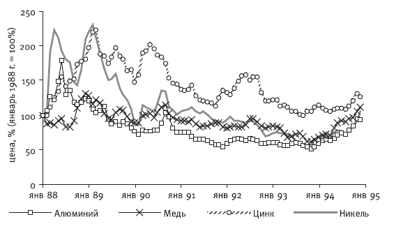 Рис. 3.8. Помесячная динамика текущих цен на цветные металлы на мировом рынке в 1988–1995 гг.