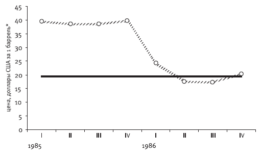 Рис. 3.14. Поквартальная динамика цены на нефть в 1985–1986 гг. на фоне среднего исторического уровня